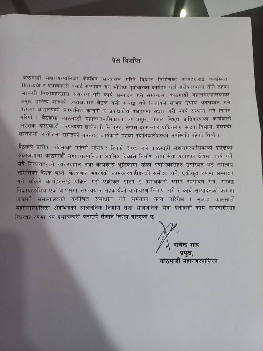 काठमाडौं । अब हरेक महिनाको पहिलो सोमबार काठमाडौं महानगरपालिकाले महानगरभित्रका सेवा प्रवाह र विकास निर्माणको क्षेत्रमा काम गर्ने निकायहरूको बैठक राख्ने भएको छ ।