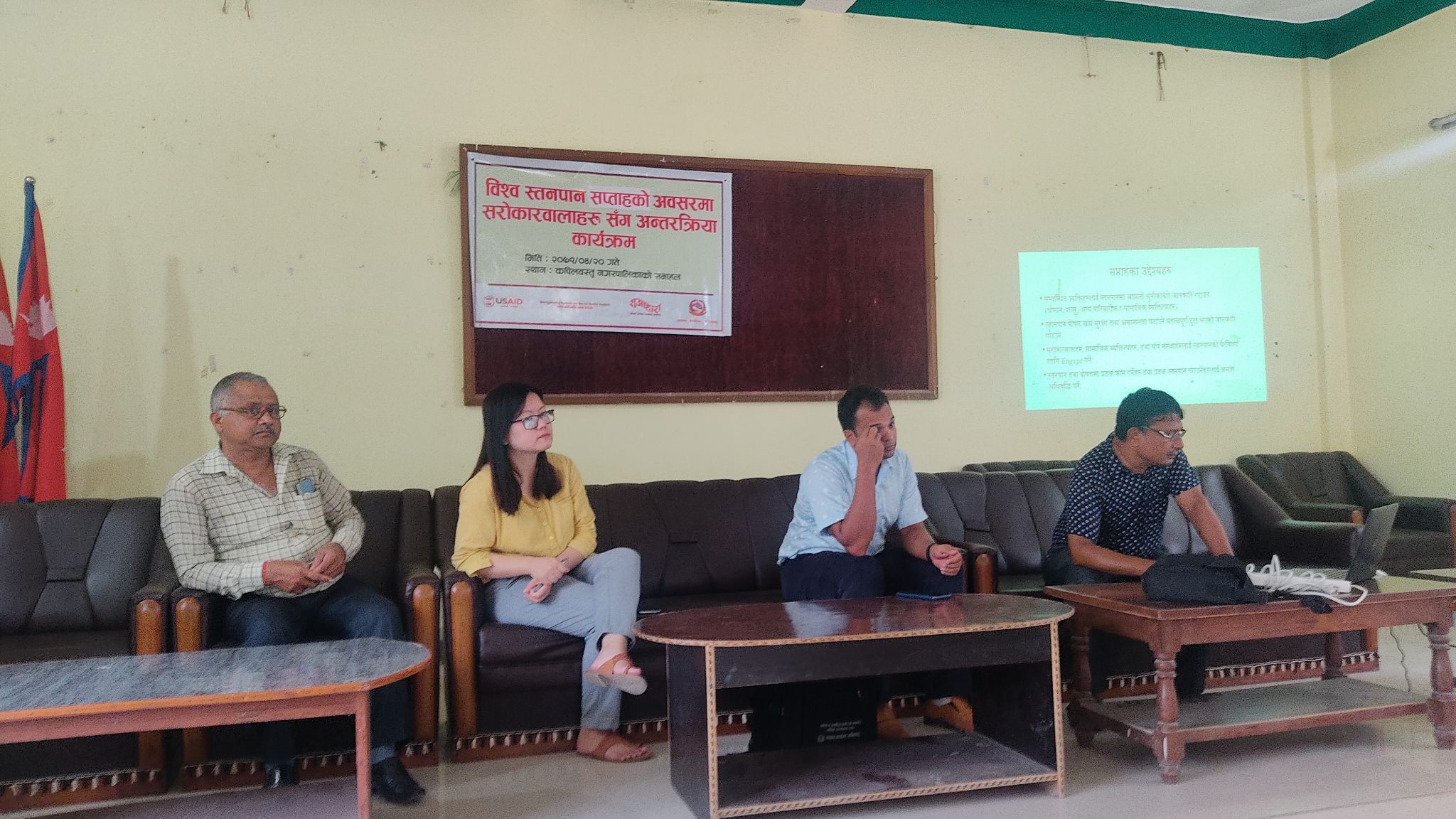 विश्व स्तनपान सप्ताह २०२२ को अवसरमा कपिलबस्तुमा अन्तरक्रिया कार्यक्रम सम्पन्न भएको छ । ‘हामी सबैको साझा जिम्मेवारी, स्तनपान संरक्षण हुन्छ प्रभावकारी’ भन्ने नारासहित साउन १६ गतेदेखि सुरु भएको २९ औँ विश्व स्तनपान सप्ताहको पाचौ दिन शुक्रबार स्वास्थ्य कार्यालय कपिलबस्तुको आयोजनामा अन्तरक्रिया कार्यक्रम सम्पन्न भएको हो । कार्यक्रममा स्तनपान सप्ताहको उद्धेश्य,महत्व तथा सप्ताहव्यापी कार्यक्रमको बारेमा जानकारी गराउनुका साथै स्तनपानको विशेषता, अवस्था र सञ्चारमाध्यमको भुमीकाको बारेमा छलफल गरिएको थियो ।