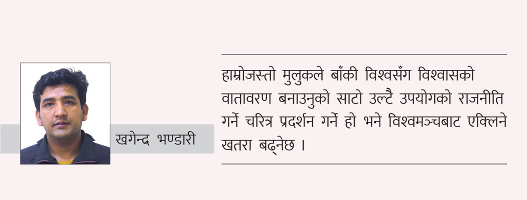 सत्ता स्वार्थमा एउटा निर्णय गर्ने अनि सत्ता बहिर्गमनपछि सोही विषयमा फरक धारणा बनाउने प्रवृत्तिले नेपालप्रतिको बाह्य बुझाइ फितलो बन्दै गएको छ । हाम्रोजस्तो मुलुकले बाँकी विश्वसँग विश्वासको वातावरण बनाउनुको साटो उल्टै उपयोगको राजनीति गर्ने चरित्र प्रदर्शन गर्ने हो भने विश्वमञ्चबाट एक्लिने चिन्ता बढ्नेछ ।
