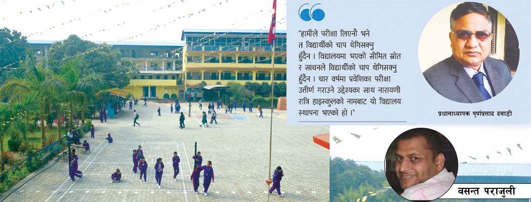 गुणस्तरमापन केन्द्रको परीक्षणमा ९३.०५ प्रतिशत अङ्क प्राप्त गरी देशकै दोस्रो उत्कृष्ट बन्न सफल यस विद्यालयमा अहिले तीन हजार ५७० विद्यार्थी अध्ययनरत छन् । “चार वर्षमा प्रवेशिका परीक्षा उत्तीर्ण गराउने उद्देश्यका साथ नारायणी रात्रि हाइस्कुलको नामबाट यो विद्यालय स्थापना भएको हो,” विद्यालयका प्रअ दवाडी विद्यालय स्थापनाको कथा भन्नुहुन्छ, “ लालटिन, मैनटोल, टुकी बालेर पढ्न आउने विद्यार्थी दिनभरिको कामले थाकेका र बढी उमेरका हुन्थे ।”