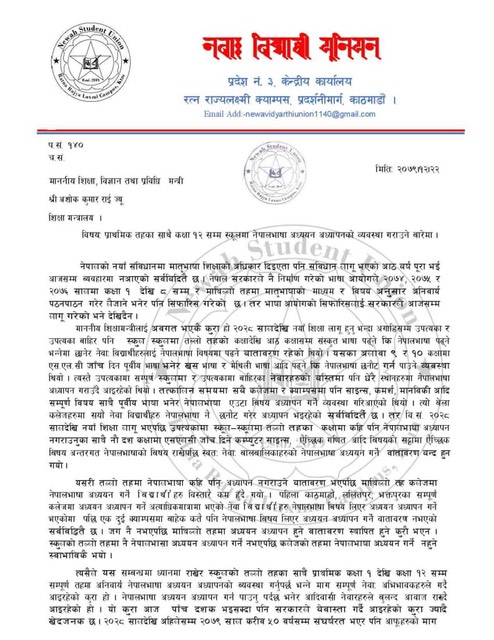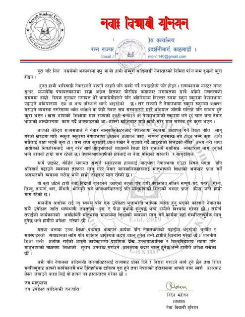 नेवाः विद्यार्थी युनियनका अध्यक्ष रिदेन महर्जन, सदस्य सुमित रञ्जित र श्रीजनमान श्रेष्ठले संयुक्त रुपमा सो ज्ञापनपत्र बुझाएका हुन् । ज्ञापनपत्रमा भनिएको छ,‘नेपालको नयाँ संविधानमा मातृभाषा शिक्षाको अधिकार दिइएता पनि संविधान लागू भएको आठ वर्ष पूरा भई आजसम्म ब्यवहारमा नआएको सर्वविदितै छ ।