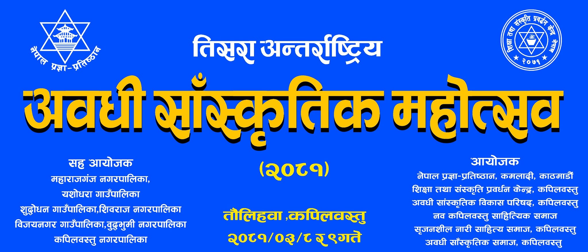 कपिलबस्तु, असार ८ गते । कपिलबस्तुको तौलिहवामा तिसरा अन्र्तराष्ट्रिय अवधी सांस्कृतिक महोत्सव हुने भएको छ । महोत्सवको उद्घाटन लुम्बिनी प्रदेशका उद्योग, पर्यटन तथा सहकारी मन्त्री खड्ग बस्नेतद्वारा गरिने छ । महोत्सव शनिबार र आईतबार गरी दुई दिन चल्ने आयोजक समितिले जानकारी दिइएको हो ।