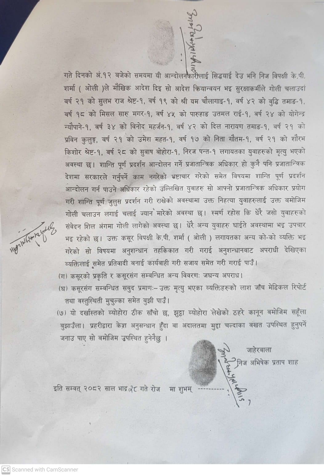 जेन जेड आन्दोलनमा गोली लागेर युवाहरूको मृत्यु भएको भन्दै पूर्व सांसद तथा काँग्रेस नेता अभिषेक प्रताप शाहले महानगरीय प्रहरी वृत्त, नयाँ बानेश्वरमा जाहेरी दर्ता गराएका हुन्। उनले कपिलवस्तुका प्रमुख जिल्ला अधिकारी दिलकुमार तामाङमार्फत जाहेरी दिएका हुन् ।