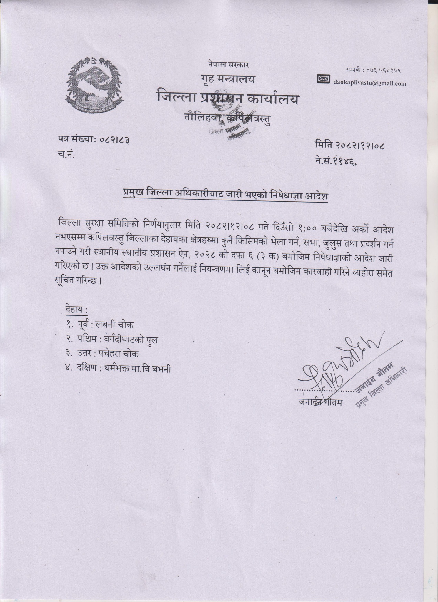 निषेधाज्ञा लागु गरिएका क्षेत्रहरूमा पूर्वमा लबनी चोक, पश्चिममा बर्दघाटको पुल, उत्तरमा पचेहरा चोक र दक्षिणमा धर्मभक्त माध्यमिक विद्यालय, भनी क्षेत्रभित्र कुनै पनि प्रकारका भेला, सभा, जुलुस तथा प्रदर्शन गर्न पाइने छैन ।